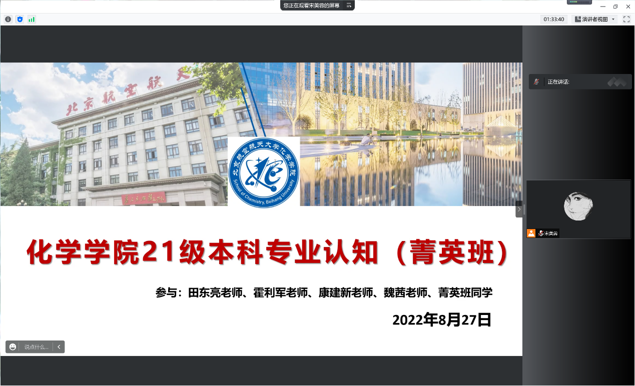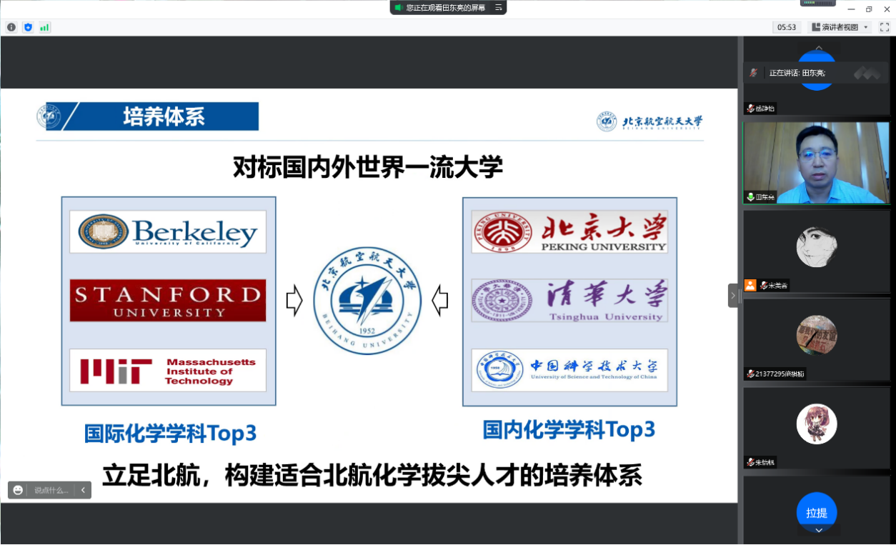 8月28日,在线买世界杯平台2021级菁英班开展系列专业认知教育活动。上午9:00,专业认知大会以腾讯会议的形式召开。本科教学副院长田东亮老师、化学生物学专业负责人霍利军老师、应用化学系康建新老师、院团委书记魏茜老师与菁英班全体同学参加了此次会议。