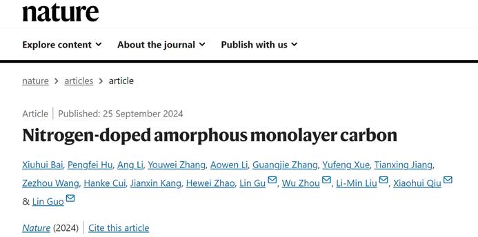 2024年9月25日,《Nature》杂志报道了在线买世界杯平台郭林教授、刘利民教授研究团队和合作者在氮掺杂单原子层非晶碳可控合成上取得的最新进展:《Nitrogen-doped amorphous monolayer carbon》。该工作提出了一种利用纳米尺度二维限域模板进行小分子聚合的液相合成策略,成功制备了氮掺杂的单原子层非晶碳材料。这项研究解决了二维非晶材料合成领域的长期挑战,为二维非晶材料在材料科学、电子器件及其他前沿技术领域的应用开辟了新途径。