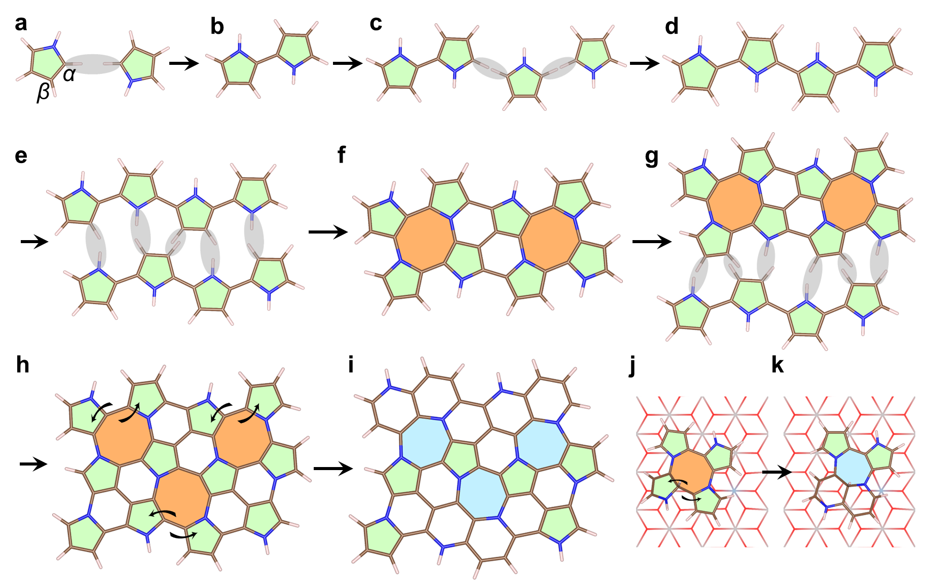 在这项研究中,由在线买世界杯平台郭林教授、刘利民教授研究团队及合作者等开创了一种全新的液相限域聚合方法。该方法通过层状模板的限域作用,抑制了分子聚合过程中的三维旋转和缠绕,使分子在二维平面内发生聚合,突破了吡咯单体在传统聚合中局限于α-C位点交联的限制,促进了β-C和N位点的交联聚合,构成平面网络结构,最终形成了五、六、七元环共存的二维非晶结构,成功在实验上验证了W. H. Zachariasen和Steven G. Louie提出的理论预测。