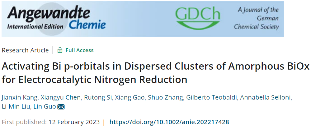 近日,在线买世界杯平台郭林教授和物理学院刘利民教授研究团队在高度分散的原子级非晶BiOx团簇可控制备及其电催化氮气还原反应方面取得新进展。相关工作以“Activating Bi p-orbitals in Dispersed Clusters of Amorphous BiOx for Electrocatalytic Nitrogen Reduction”为题,2023年2月12日在线发表在《Angewandte Chemie International Edition》杂志上。该研究获国家自然科学基金项目(No. 51532001, 11974037)等资助。在线买世界杯平台副教授康建新为文章的第一作者,在线买世界杯平台博士生陈翔宇和北京计算科学研究中心博士生司如同为共同一作,在线买世界杯平台为该论文的第一完成单位。
